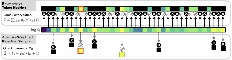 The dominant approach to generating from language models subject to some constraint is locally constrained decoding (LCD), incrementally sampling tokens at each time step such that the constraint is never violated. Typically, this is achieved through token masking: looping over the vocabulary and excluding non-conforming tokens. There are two important problems with this approach. (i) Evaluating the constraint on every token can be prohibitively expensive, since language model vocabularies often exceed 100,000 tokens. (ii) LCD can distort the global distribution over strings, sampling tokens based only on local information, even if they lead down dead-end paths. This work introduces a new algorithm that addresses both these problems. First, to avoid evaluating a constraint on the full vocabulary at each step of generation, we propose an adaptive rejection sampling algorithm that typically requires orders of magnitude fewer constraint evaluations. Second, we show how this algorithm can be extended to produce low-variance, unbiased estimates of importance weights at a very small additional cost - estimates that can be soundly used within previously proposed sequential Monte Carlo algorithms to correct for the myopic behavior of local constraint enforcement. Through extensive empirical evaluation in text-to-SQL, molecular synthesis, goal inference, pattern matching, and JSON domains, we show that our approach is superior to state-of-the-art baselines, supporting a broader class of constraints and improving both runtime and performance. Additional theoretical and empirical analyses show that our method's runtime efficiency is driven by its dynamic use of computation, scaling with the divergence between the unconstrained and constrained language model, and as a consequence, runtime improvements are greater for better models.